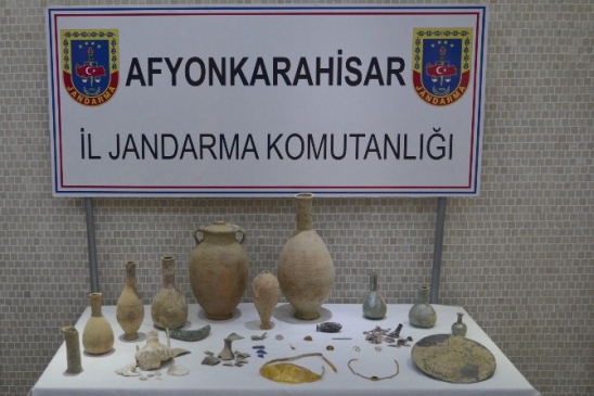 Afyonkarahisar'da jandarma, gerçekleştirdiği bir operasyonla Helenistik ve Roma dönemine ait 25 parça tarihi eseri ele geçirdi. Afyonkarahisar İl Jandarma Komutanlığı tarafından yapılan açıklamada, M.D. isimli bir şahsın eski eserleri satma niyetinde olduğuna dair istihbari bilgiler alındığı belirtildi. Bu bilgiler doğrultusunda harekete geçildi. Operasyon sırasında, şahıs suçüstü yakalanarak, yanında 1 adet altın alın bağı, 1 adet altın kolye, 2 adet altın küpe, 1 adet altın yüzük, 2 adet altın obje, 1 adet cam koku kabı, 1 adet metal ayna ve 16 adet toprak ve cam testi olmak üzere toplam 25 parça tarihi eser ele geçirildi. Olayla ilgili olarak M.D. hakkında adli işlemler başlatıldı.