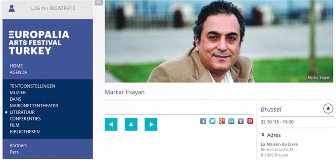 İki yılda bir düzenlenen ve bir ülkenin kültürel mirasını sanat yoluyla mercek altına alan Uluslararası Sanat Festivali Europalia, 6 Ekim’de startı verilecek olan etkinlikle 4 ay boyunca Türkiye’nin kültür ve sanat alanında tanıtımını yapacak. Festival yetkilileri yaklaşık 200’den fala etkinliğin yer aldığı programda son anda bir değişiklik yaptı. Edebiyat söyleşileri serisinde AK Parti milletvekilleri Markar Esayan ve Muhsin Kızılkaya'nın yapacağı söyleşiler "hükümet propagandasın alet olmamak" için partner kurum tarafından programdan çıkarıldı.