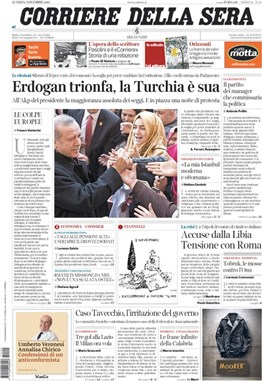 Corriere della Sera gazetesi de haberi büyük "Erdoğan'ın zaferi, Türkiye onun" manşetiyle birinci sayfadan okuyucularına ulaştırdı. Alt başlıkta ise AK Parti'nin mecliste yeterli çoğunluğu sağlayarak iktidara geldiği fakat güneydoğu illerinde sokaklarda protestoların yaşandığı belirtildi.