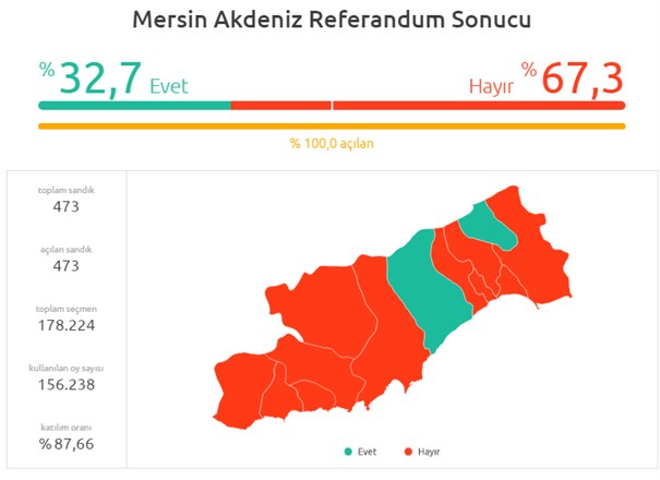 AKDENİZ REFERANDUM SONUÇLARI Toplam sandık: 473 Açılan sandık: 473 Toplam seçmen.: 178.224 Kullanılan oy:156.238 Geçerli oy:153.297 MERSIN AKDENİZ İLÇESİ EVET: %33 HAYIR:%67