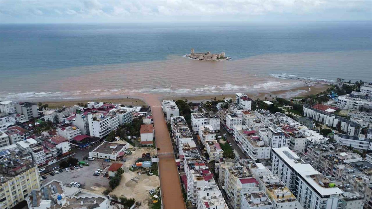 Mersin'de süren yağışlar nedeniyle Kızkalesi çevresindeki derelerden akan sel suları, bölgeyi hem çamurla hem de kahverengi bir görünümle kapladı.