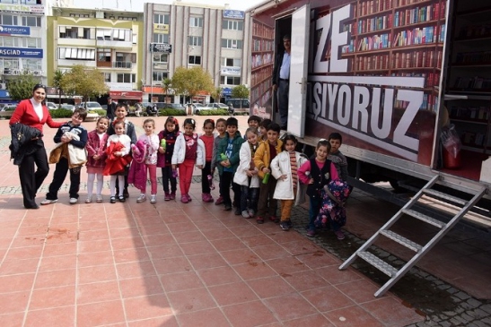 İzmir'in Aliağa ilçesinde gerçekleştirilen Gezici Kütüphane etkinliği, okuma alışkanlığının kazandırılması amacıyla düzenlendi. İzmir Atatürk İl Halk Müdürlüğü'ne ait gezici kütüphane aracı, Aliağa İlçe Halk Kütüphanesi tarafından organize edilen etkinlikte minik öğrencilerin ziyaretine açıldı. Binlerce kitap içeren gezici kütüphane, Aliağalı öğrencilere kitap sevgisini aşılamak için bu etkinlikte yer aldı. Aliağa Demokrasi Meydanı'nda yapılan etkinliğe, ilçe genelindeki ilköğretim okullarında öğrenim gören öğrenciler katıldı. Öğrenciler, gezici kütüphane aracını gezme ve içerisindeki kitapları inceleme fırsatı buldu. Etkinlik sonunda öğrenciler, Aliağa İlçe Halk Kütüphanesi'ni de ziyaret ederek kütüphane yetkililerinden kitaplar hakkında bilgi aldı. Ziyaretin anısına öğrenciler, kütüphane önünde hatıra fotoğrafı çektirdi.