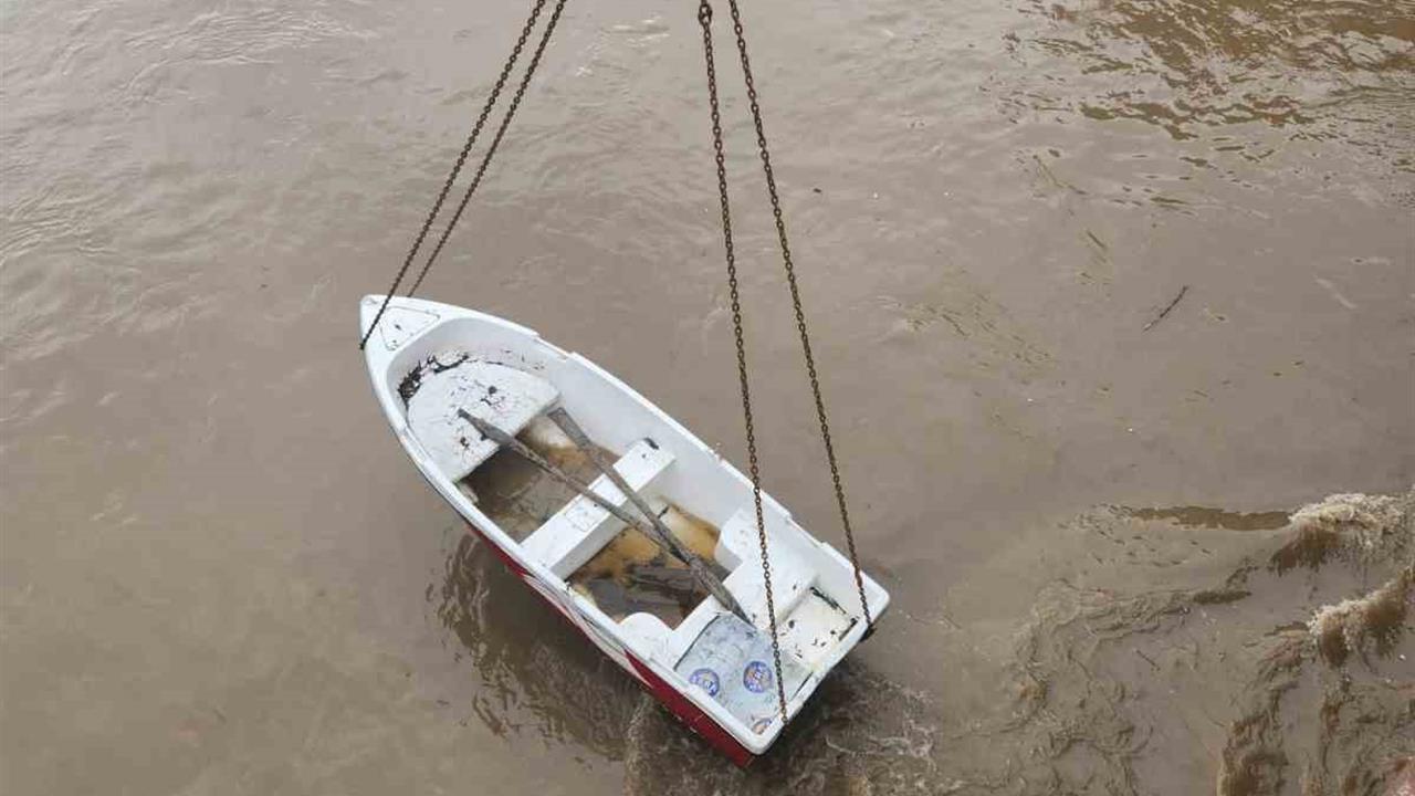 Amasya'da debisi artan Yeşilırmak Nehri'nde köprü ayağına takılan kayık, vinç yardımıyla kurtarıldı.
