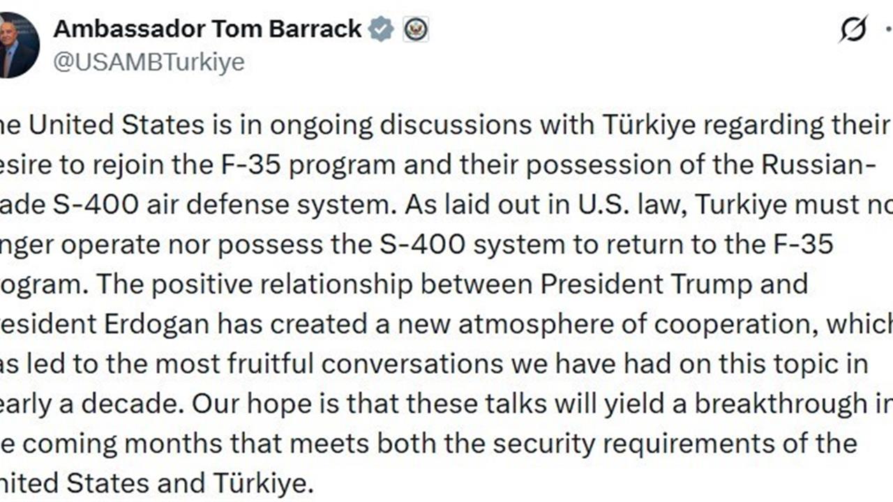 ABD’nin Ankara Büyükelçisi Barrack, F-35 programı ile ilgili önemli açıklamalarda bulundu. Türkiye ve ABD arasında sürdürülen görüşmelere dikkat çeken Barrack, iki ülke arasındaki olumlu ilişkilerin bu süreçteki etkisine vurgu yaptı. Başkan Trump ve Cumhurbaşkanı Erdoğan arasındaki işbirliği ortamının, son on yıldaki en verimli görüşmelere olanak sağladığını söyledi. Barrack, bu görüşmelerin yakın zamanda her iki ülkenin güvenlik ihtiyacını karşılayacak bir dönüm noktası oluşturmasını umduklarını ifade etti.