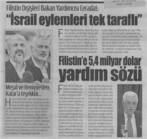 Ertesi gün Türkiye'deki bazı gazetelerde Haniye'nin açıklamaları geniş yer buldu. Yeni Şafak gazetesi, 'vaadinizi tutun' başlığıyla bu eleştirileri öne çıkardı. Ayrıca, Hamas liderleri, konferansta en yüksek vaatte bulunan Katar’a teşekkür ederek, bu ülkenin yardımlarını değerlendirdiler. Hamas’ın Siyasi Büro Şefi Halid Meşal ve İsmail Haniye, Katar'ın Filistin’e yönelik desteğini önemsediklerini belirtti.