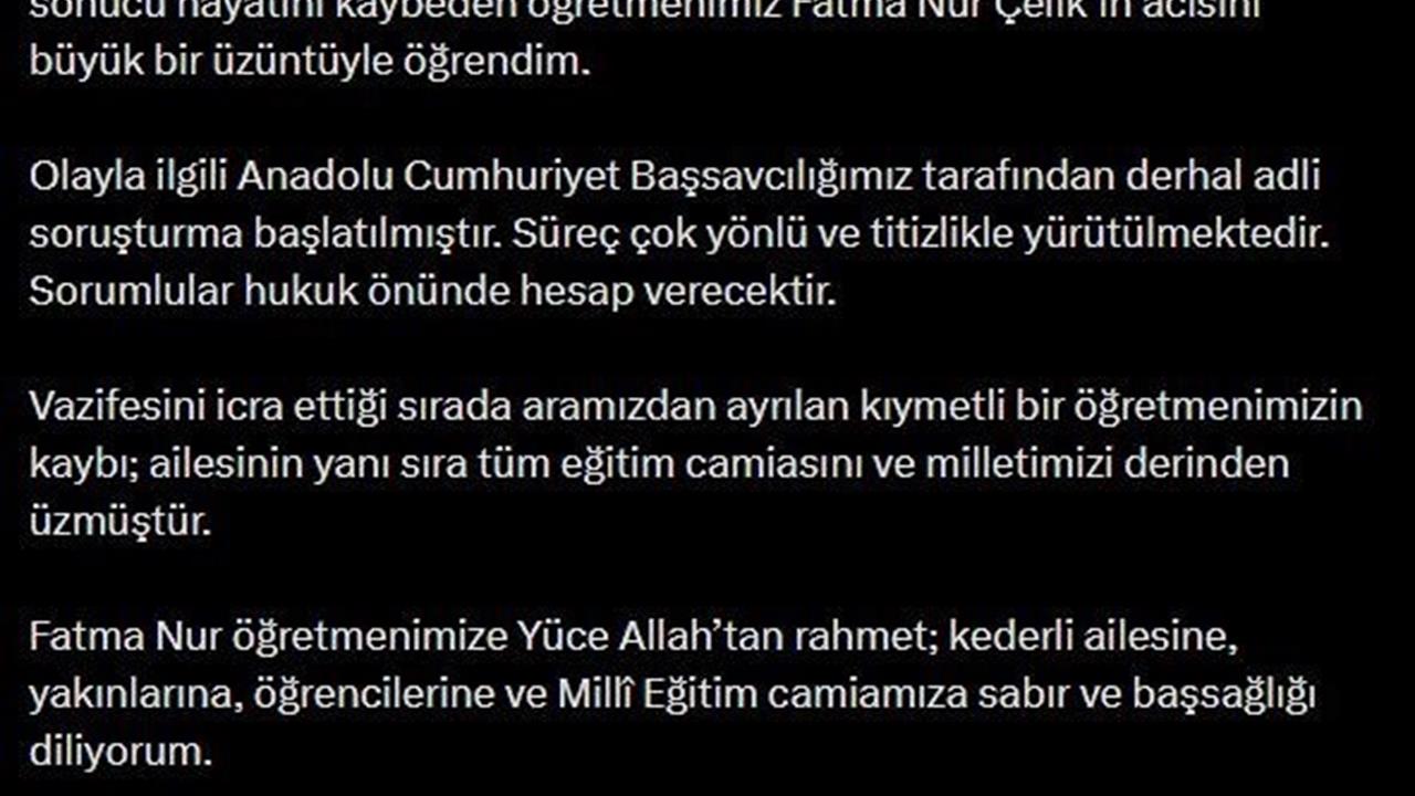 Adalet Bakanı Akın Gürlek, İstanbul'un Çekmeköy ilçesinde bir lisede gerçekleşen saldırıda hayatını kaybeden öğretmen Fatma Nur Çelik’in kaybı nedeniyle derin üzüntü duyduğunu ifade etti. Gürlek, "Olayla ilgili Anadolu Cumhuriyet Başsavcılığımız tarafından derhal adli soruşturma başlatılmıştır. Süreç çok yönlü ve titizlikle yürütülmektedir. Sorumlular hukuk önünde hesap verecektir." dedi. Çelik’in aramızdan ayrılmasının eğitim camiası ve millet için büyük bir kayıp olduğunu belirten Bakan Gürlek, "Fatma Nur öğretmenimize Yüce Allah’tan rahmet; kederli ailesine, yakınlarına, öğrencilerine ve Milli Eğitim camiamıza sabır ve başsağlığı diliyorum." ifadelerini kullandı. Ayrıca, saldırıda yaralanan öğrenci ve öğretmen için de acil şifalar diledi. Bakan, eğitim camiasına ve millete geçmiş olsun dileklerini iletti.