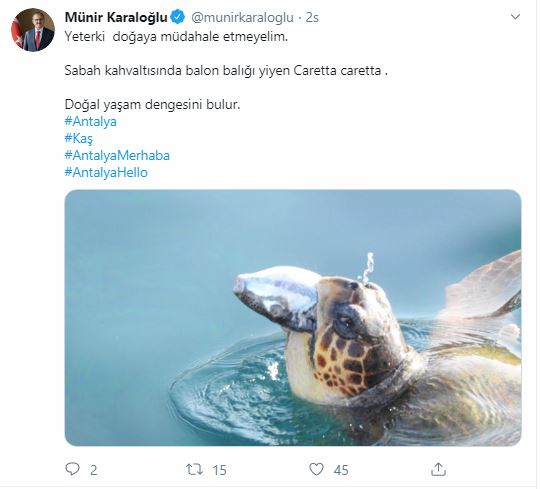 Antalya Valisi Münir Karaloğlu sosyal medya hesabından "Sabah kahvaltısında balon balığı yiyen caretta caretta. Yeter ki doğaya müdahale etmeyelim. Doğal yaşam dengesini bulur" başlığıyla yaptığı paylaşımda doğanın dengesinin korunmasına dikkat çekti.mersinhaber.com