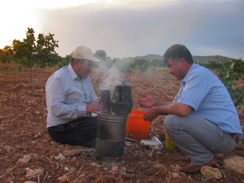 Araban'daki Antep fıstığı üreticileri, akşam saatlerinde bahçelerde çalıştıktan sonra gün batımında közde çay keyfi yapıyor.