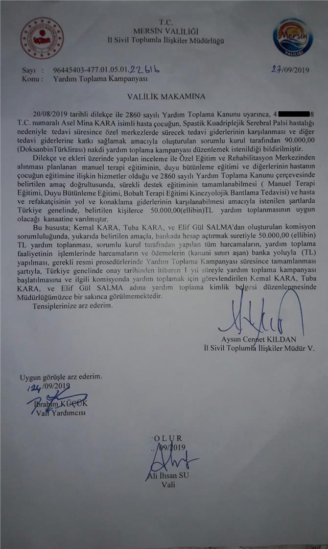 Şu an Asel Mina’nın tedavi sürecinin devam ettiğini ifade eden anne Tuba Kara, “özel egitim ve fizik tedaviye götürüyoruz. Buda bize çok pahalı mal oluyor. Mersin Valiliğinde alınan izinle yardım kampanyası başlattıldı.” Dedi.