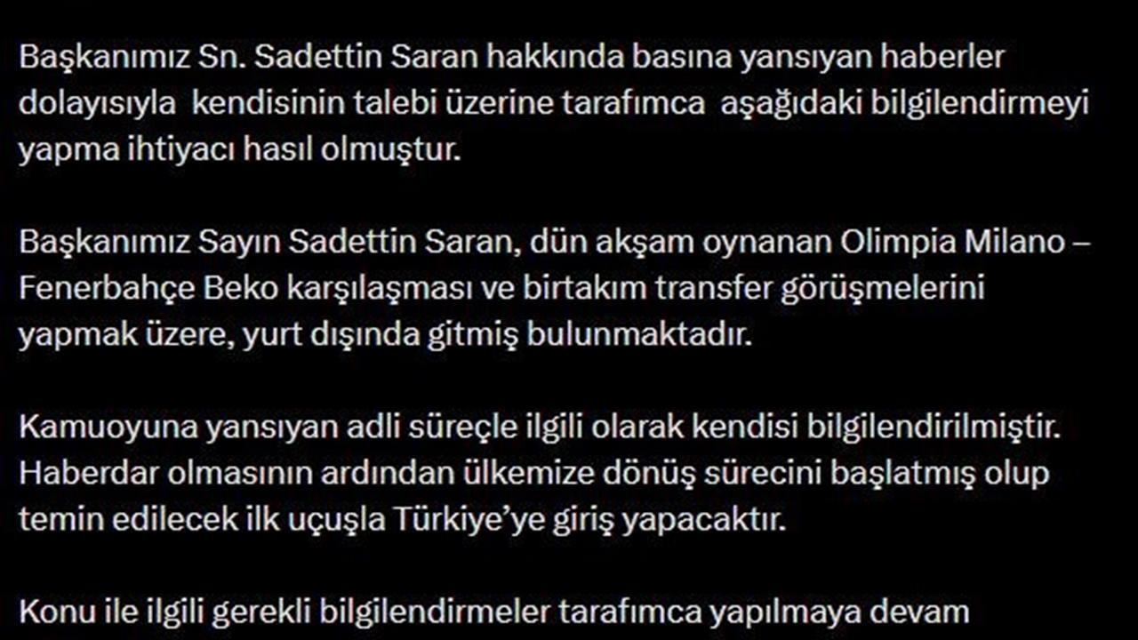 İstanbul Cumhuriyet Başsavcılığı tarafından yürütülen uyuşturucu soruşturması çerçevesinde Fenerbahçe Spor Kulübü Başkanı Sadettin Saran, ifadeye çağrıldı. Avukat Ali Alper Alpoğlu, yaptığı yazılı açıklamada, Saran'ın yurt dışında bulunduğunu ve Türkiye’ye döneceğini bildirdi. Saran'ın, Olimpia Milano ile oynanan maç ve bazı transfer görüşmeleri için yurt dışına gittiği belirtildi. Alpoğlu, Saran'ın konuyla ilgili bilgilendirildiğini ve dönüş sürecini başlattığını ifade etti. İlk uçakla Türkiye’ye giriş yapacağına dair bilgi verdi. Bu süreçle ilgili olarak gerekli bilgilendirmelerin devam edeceği vurgulandı.
