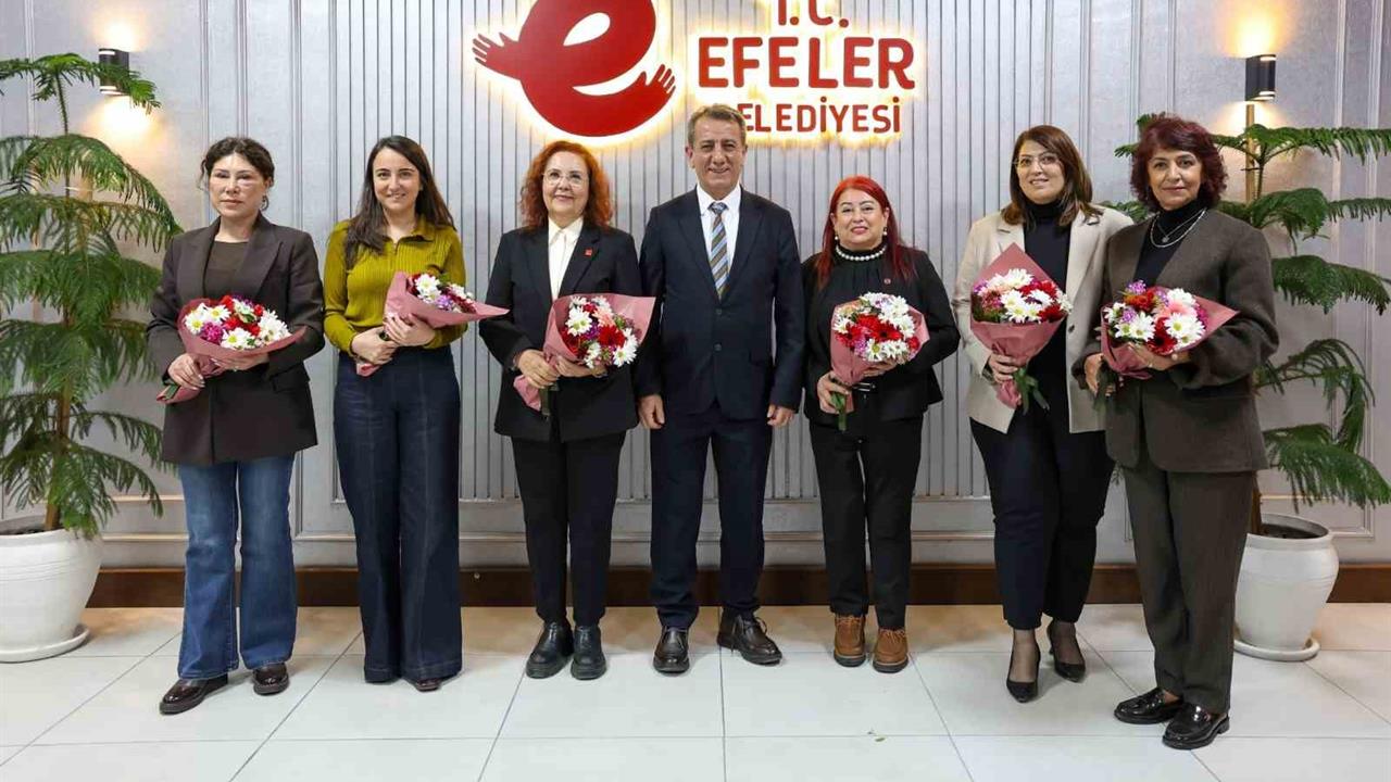 Efeler Belediye Başkanı Anıl Yetişkin, 3 Nisan'da kadın meclis üyelerine çiçek vererek kadınların yerel yönetimlerdeki önemine dikkat çekti.
