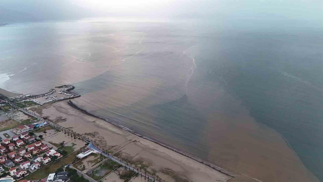 Aydın Kuşadası’nda etkili olan sağanak yağışın ardından meydana gelen sel baskınları, plajda yarıklar oluşturdu ve denizin rengini değiştirdi.