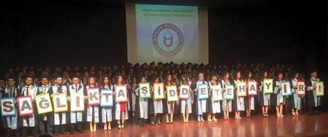 Aydın'da Adnan Menderes Üniversitesi (ADÜ) Tıp Fakültesi'nden mezun olan genç doktorlar, mezuniyet törenlerinde "Sağlıkta Şiddete Hayır" pankartı açarak dikkat çekti. Bu yıl on ikinci kez düzenlenen mezuniyet törenine 124 yeni hekim katıldı. Mezunlar, yoğun eğitim süreçlerinin ardından yaşanan sağlıkta şiddet olayları nedeniyle endişelerini dile getirerek, bu durumun hastalarına verecekleri hizmeti de etkileyebileceğini ifade etti.