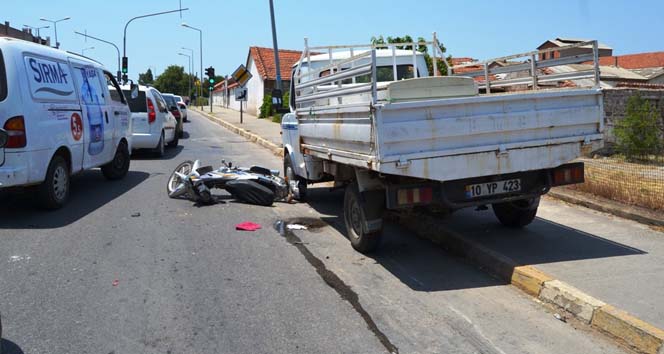 Alınan bilgiye göre, Armutçuk istikametinden gelen 10 BBD 16 plakalı motosiklet ile 10 YP 423 plakalı kamyonet çarpıştı. Olayın ardından motosiklet sürücüsü Muzaffer S. yaralı olarak ambulansla Ayvalık Devlet Hastanesi’ne kaldırıldı. Yaralının sağlık durumunun iyi olduğu bildirildi.