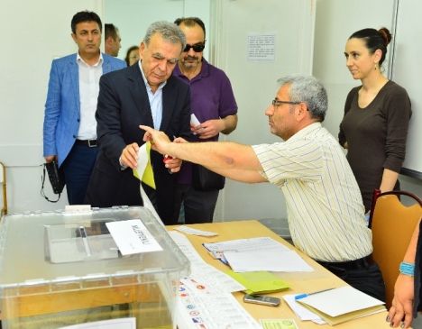 İzmir Büyükşehir Belediye Başkanı Aziz Kocaoğlu, Bornova'daki okula giderek genel seçimde oyunu kullandı.