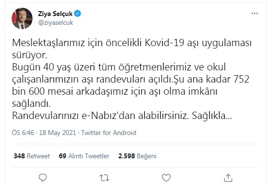 Bugün 40 yaş üzeri tüm öğretmenlerimiz ve okul çalışanlarımızın aşı randevuları açıldı.Şu ana kadar 752 bin 600 mesai arkadaşımız için aşı olma imkânı sağlandı.