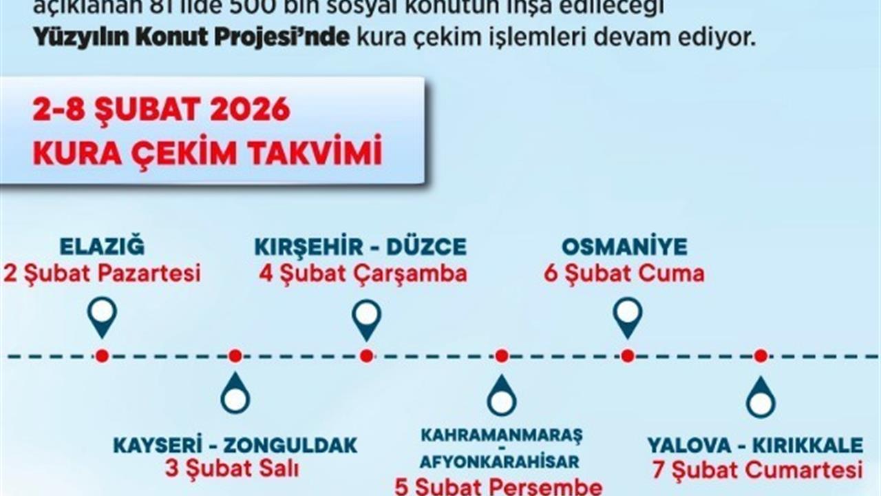 2-8 Şubat haftasında toplam 36 bin 458 sosyal konutun hak sahiplerinin belirleneceği bildirilirken, kura takvimine göre; 2 Şubat Pazartesi Elazığ’da 3 bin 825, 3 Şubat Salı Kayseri’de 7 bin 562, Zonguldak’ta bin 872, 4 Şubat Çarşamba Kırşehir’de bin 633, Düzce’de 2 bin 470, 5 Şubat Perşembe Kahramanmaraş’ta 8 bin 195, Afyonkarahisar’da 4 bin 370, 6 Şubat Cuma Osmaniye’de 2 bin 990, 7 Şubat Cumartesi Yalova’da bin 805, Kırıkkale’de bin 736 konut için kura çekimi yapılacaktır.