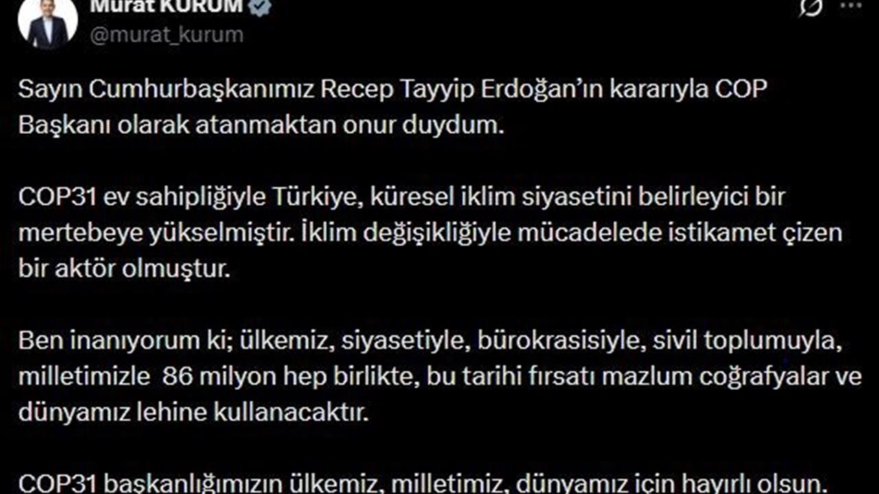 Çevre, Şehircilik ve İklim Değişikliği Bakanı Murat Kurum, Cumhurbaşkanı Recep Tayyip Erdoğan'ın talimatıyla COP Başkanı olarak görevine başlamış bulunuyor. Sosyal medya üzerinden yaptığı açıklamada, bu göreve atanmaktan duyduğu onuru dile getiren Bakan Kurum, Türkiye’nin COP31 ev sahipliği ile küresel iklim siyasetinde belirleyici bir konuma ulaşacağını vurguladı.
