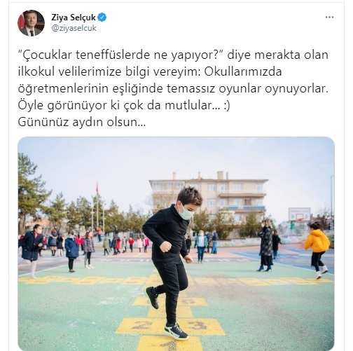 “ “Çocuklar teneffüslerde ne yapıyor?” diye merakta olan ilkokul velilerimize bilgi vereyim: Okullarımızda öğretmenlerinin eşliğinde temassız oyunlar oynuyorlar. Öyle görünüyor ki çok da mutlular... :)