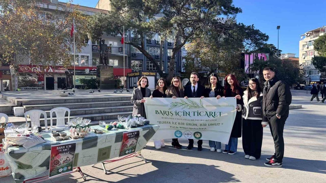Burhaniye Uygulamalı Bilimler Fakültesi, sosyal sorumluluk çalışmaları çerçevesinde "BUBFA ile Barış İçin Ticaret" projesini hayata geçirdi. Proje kapsamında, fakülte öğrencileri tarafından üretilen Filistin temalı 100 adet ürün, Burhaniye Cumhuriyet Meydanı’nda kurulan satış standında satışa sunuldu. "Bir Ürün, Bir Umut" mottosuyla gerçekleştirilen etkinlikte, elde edilen gelir Filistinli çocukların eğitimine destek sağlamak için bağışlandı.