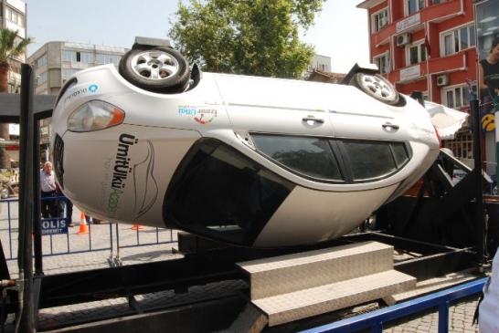 Balıkesir Edremit'te düzenlenen etkinlikte alkol gözlüğü ile sürücülerin alkollü halinin etkileri simüle edildi. Ayrıca, emniyet kemerinin önemi de vurgulandı.