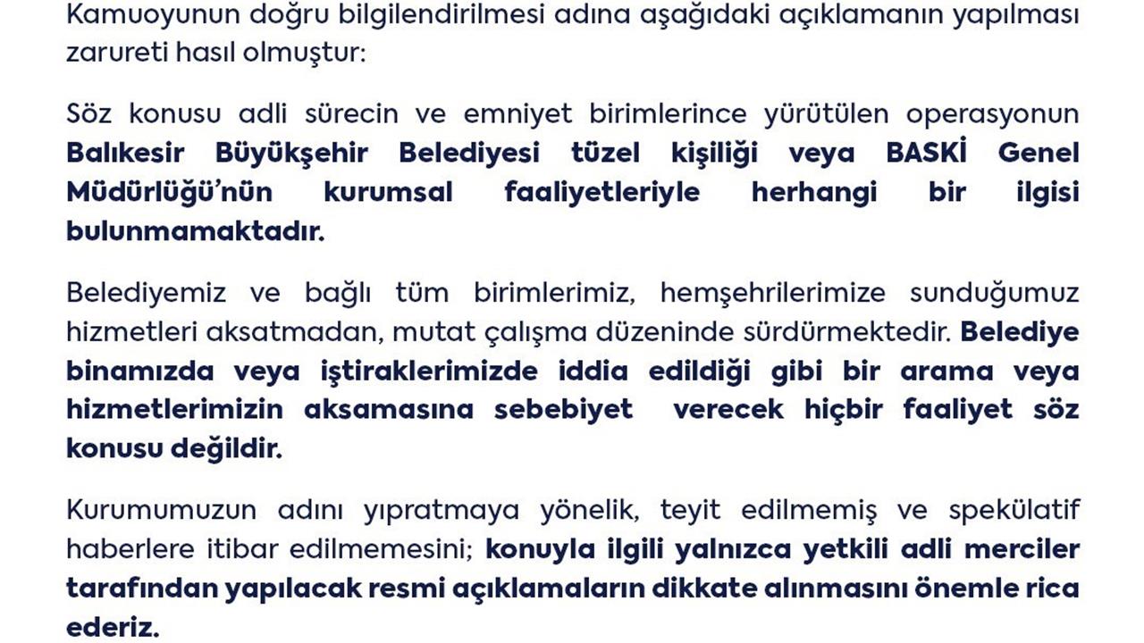 Açıklamaya göre, yürütülen adli süreçlerin Balıkesir Büyükşehir Belediyesi’nin faaliyetleriyle herhangi bir ilgisi bulunmamakta. Belediyenin herhangi bir biriminde, gözaltına alınanlarla ilgili bir arama veya hizmetlerin aksamasına neden olacak bir durum yaşanmadığı ifade edildi. Ayrıca, Balıkesir Büyükşehir Belediyesi, hemşehrilerine sunduğu hizmetleri aksatmadan sürdürdüğünü belirtti. Belediye, kurumun adını yıpratmaya yönelik spekülatif haberlere itibar edilmemesi gerektiğini ve sadece yetkili adli mercilerin resmi açıklamalarının dikkate alınmasını istedi.