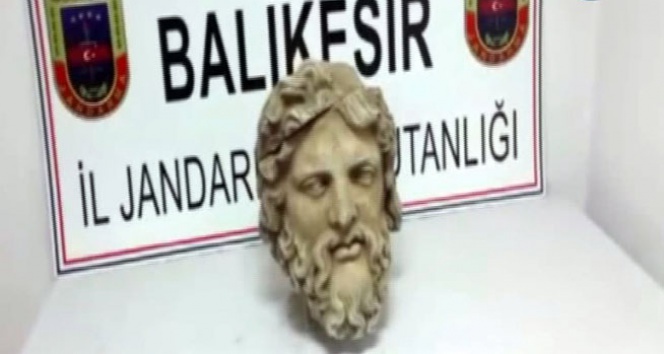 Balıkesir'de jandarma, Zeus kafası heykelini 650 bin TL'ye satmaya çalışan 4 kişiyi yakaladı.