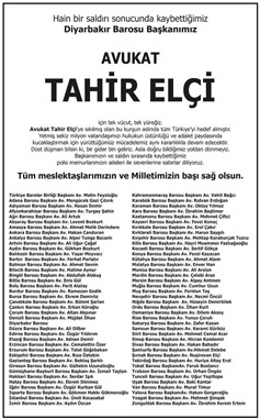 TBB ve 79 baro, Diyarbakır Baro Başkanı Tahir Elçi’nin öldürülmesine ilişkin başsağlığı mesajı yayımladı. Mesajda şu ifadeler yer aldı: "Hain bir saldırı sonucu kaybettiğimiz Diyarbakır Barosu Başkanımız Tahir Elçi için tek vücut tek yüreğiz. Tahir Elçi’ye sıkılmış olan bu kurşun aslında tüm Türkiye’yi hedef almıştır. Yetmiş sekiz milyon vatandaşımızı hukukun üstünlüğü ve adalet paydasında kucaklaştırmak için yürüttüğümüz mücadelemiz aynı kararlılıkla devam edecektir. Dost düşman bilsin ki bin gider bin geliriz. Asla doğru bildiğimiz yoldan dönmeyiz. Başkanımız ve saldırı sırasında kaybettiğimiz polis memurlarımızın aileleri ve sevenlerine sabır diliyoruz. Tüm meslektaşlarımızın ve milletimizin başı sağ olsun.”
