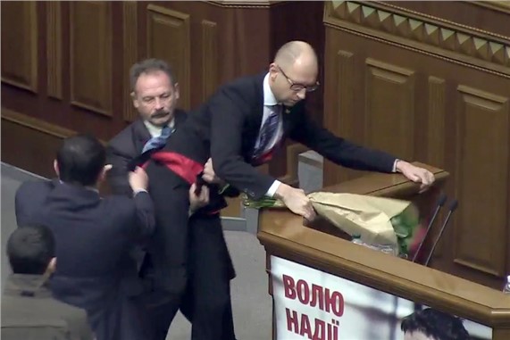 Başbakan Yatsenük’e çiçek takdim etme bahanesiyle kürsüye yaklaşan Barna, çiçeği verdikten hemen sonra Yatsenük'ü bacaklarının arasında kucaklayıp kürsüden uzaklaştırmaya çalıştı. Halk Cephesi milletvekilleri liderlerinin imdadına yetişerek Barna’nın kucağından Yatsenük’ü aldı. Barna’ya saldıran Halk Cephesi milletvekilleri Barna’yı şiddetli bir şekilde dövdü. Halk Cephesi vekillerinin elinden Barna’yı zor aldılar.
