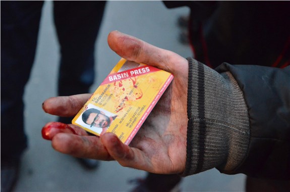 İSTANBUL - Millet gazetesinden Mustafa Kılıç, İpek Medya Grubu’na yapılan baskında polis tarafından tartaklandı. Vücuduna aldığı darbe sebebiyle yaralanan Kılıç, "Basın kartıma kan bulaştı" dedi.