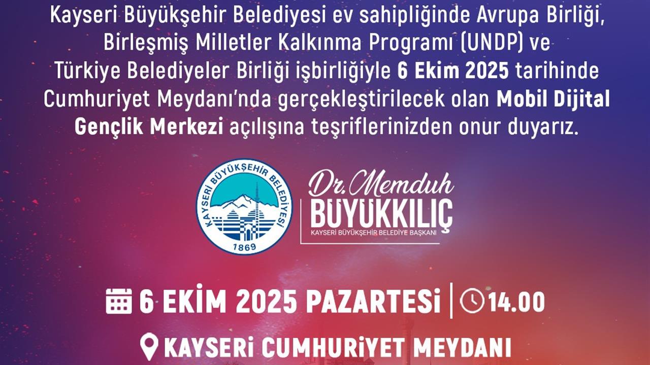 Kayseri Büyükşehir Belediyesi, gençleri dijital geleceğe hazırlamak amacıyla Avrupa Birliği destekli Mobil Dijital Gençlik Merkezi'ni açıyor. Bu proje, Birleşmiş Milletler Kalkınma Programı (UNDP) ve Türkiye Belediyeler Birliği iş birliğiyle hayata geçiriliyor. Başkan Dr. Memduh Büyükkılıç, açılışın 6 Ekim Pazartesi günü saat 14.00’te gerçekleşeceğini açıkladı. Merkez, bilim ve teknoloji alanında gençlerin yeteneklerini geliştirmelerine yardımcı olmayı hedefliyor.