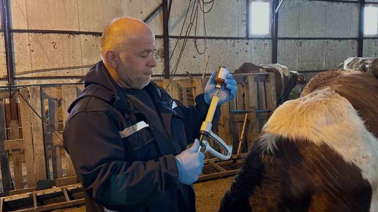 Bayburt'un Aydıntepe ilçesinde, büyükbaş hayvanlara yönelik şap aşılama ve buzağı küpeleme çalışmaları, İlçe Tarım ve Orman Müdürlüğü'ne bağlı veteriner hekimlerce titizlikle sürdürülüyor.