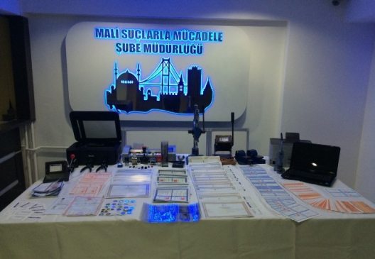 Mali Suçlarla Mücadele Şube Müdürlüğü ekipleri, Beylikdüzü, Küçükçekmece ve Bahçelievler'de sahte evrak düzenleyen kişilere yönelik bir operasyon gerçekleştirdi. Operasyon sonucunda 3 ayrı adreste yapılan aramalarda, bin 700 adet sahte içki bandrolü, 700 adet sahte diploma, 700 adet boş sahte su faturası, 300 adet boş nüfus cüzdanı, 200 adet motorlu araç trafik belgesi, 200 adet boş sürücü belgesi ile çeşitli kurumlara ait kaşe ve mühürler ele geçirildi. Ayrıca, sahte sürücü belgesi, resmi evrak yapımında kullanılan pres ve sabitleyici baskı makineleri, yazıcı ve 2 adet bilgisayar da bulundu. Ele geçirilen malzemeler arasında sahte taksi çalışma ruhsatnamesi, sahte sigara bandrolü ve sahte tapu gibi belgeler de yer aldı. Gözaltına alınan T.Ü. (43) ve B.Ö. (48) emniyetteki işlemlerinin ardından adliyeye sevk edildi.