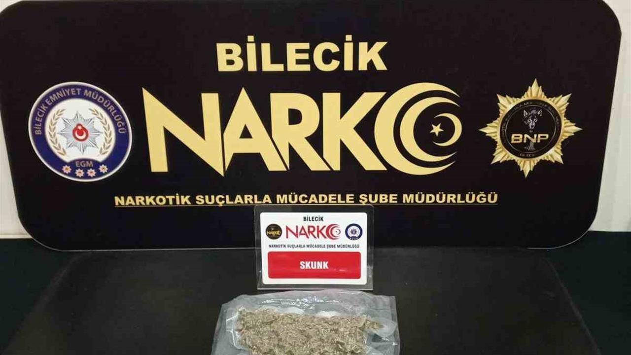 Bilecik'te, Narkotik Suçlarla Mücadele Şube Müdürlüğü ekipleri, yol kontrolleri sırasında bir otomobili durdurdu. Alınan bilgilere göre, sürücünün şüpheli hareketleri dikkat çekti. Bu durum üzerine ekipler derhal harekete geçti. Narkotik köpeği, otomobilin bagaj kısmında yaptığı aramada yoğunlaşınca, bölgeye odaklandı. Yapılan detaylı incelemede bagajda yer alan çadırın içinde 220,52 gram 'Skunk' uyuşturucu maddesi ele geçirildi. Olayla ilgili olarak araçta bulunan iki kişi gözaltına alındı ve ilk sorgulamalarının ardından adliyeye sevk edildi. Mahkeme tarafından bir kişi adli kontrol şartıyla serbest bırakılırken, diğer şahıs savcılık işlemleri sonrası serbest bırakıldı.