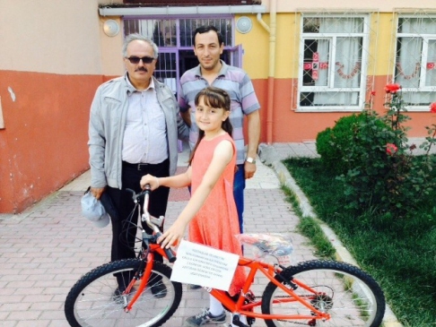 Bilecik merkez Bahçelievler Mahallesi'nde manavlık yapan Ekrem Yoldaş, Malhatun İlkokulu'nda sömestre tatilinden sonra başarısını en çok artıran öğrenci olan 4-B sınıfı öğrencisi Ezgi İşleyici'ye bisiklet hediye etti.