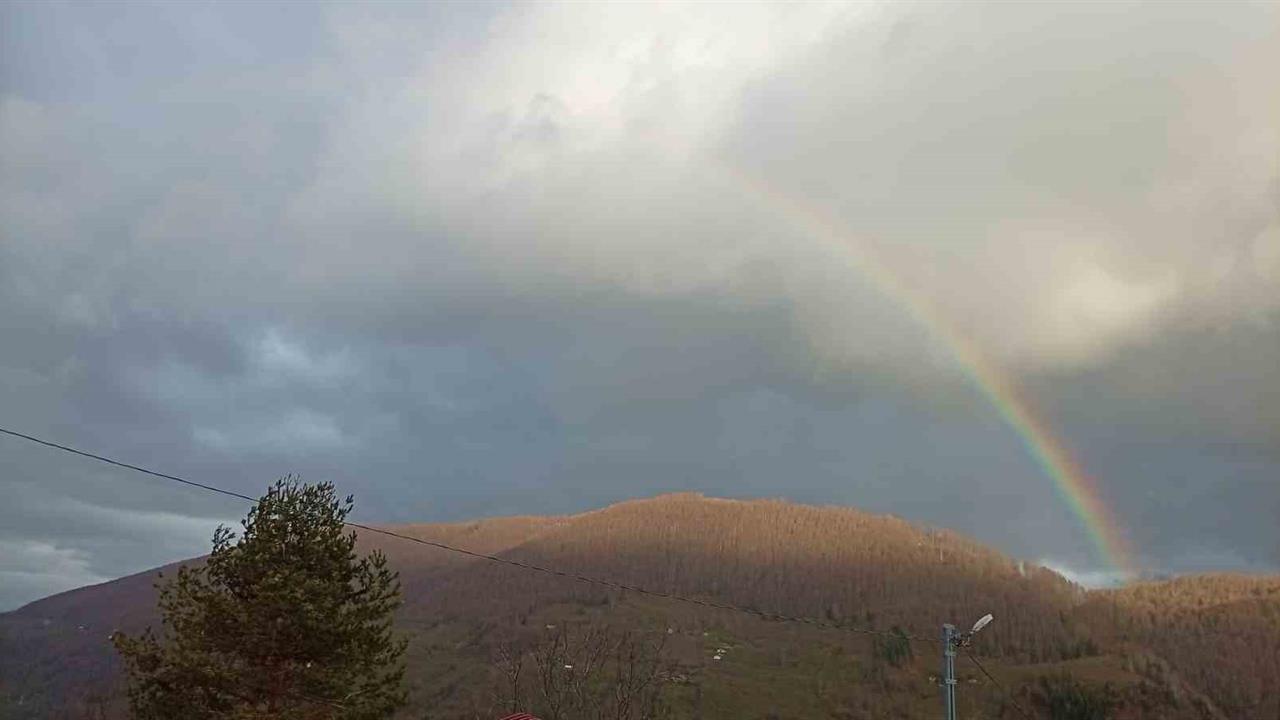 İlçenin yüksek kesimlerinde etkili olan sağanak yağışın ardından, güneşin çıkmasıyla birlikte gökyüzünde renkli bir görüntü oluştu. Bulutların arasından süzülen güneş ışıkları, bölgede bulunan sis tabakasıyla birleşerek gökkuşağını ortaya çıkardı. Bu doğal güzellik, yeşil doğanın üzerinde etkileyici bir manzara sundu ve bölge halkının ilgisini çekti.