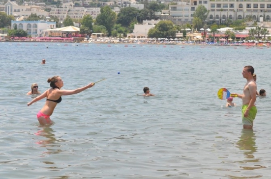 Güneşli havanın tadını çıkaran turistler, deniz içinde oyunlar oynarken, bazıları ise su sporları yaparak eğlenceli anlar yaşadı. Deniz suyu sıcaklığının 19 derece ölçüldüğü Bodrum'da, plajlar adeta birer eğlence merkezi haline geldi. Bu dönemde Bodrum'un plajları, yerli halktan uzak, turistlerle dolup taştı.