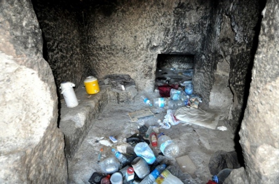 Bodrum’un Göktepe yamaçlarında bulunan ve 13 bin kişilik Antik Tiyatro’nun da yer aldığı yüzlerce kaya mezarı, evsizlerin mekanı haline geldi. Oda mezarlarının içindeki çöp yığınları, hem yerel halkın hem de ziyaretçilerin tepkisini çekiyor. Bölgede yürütülen inşaat çalışmaları sırasında Bodrum Sualtı Arkeoloji ve Müze Müdürlüğü ekipleri, 11 adet kaya mezarı tespit etti. Ancak inşaat sırasında kepçelerin verdiği zarar nedeniyle mezarların durumu oldukça kötüye gitti.