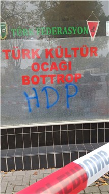 BOCHUM - Almanya'nın Bottrop şehrindeki Ülkü Ocağı’na gece geç saatlerde kimliği belirsiz kişi ya da kişiler tarafından saldırıda bulunuldu. Saldırganlar duvara yazı yazdı, molotof attı. Hadiseyi "hain bir saldırı" olarak niteleyen Almanya Türk Federasyon KRV 2. Bölge Başkanı Ahmet Şahin, "Olayın gece 2.30 civarında meydana geldiğini tahmin ediyoruz. Camlara yazılar yazılmasından başka içeriye molotof atılmış; çok şükür alev almamış." diye konuştu.