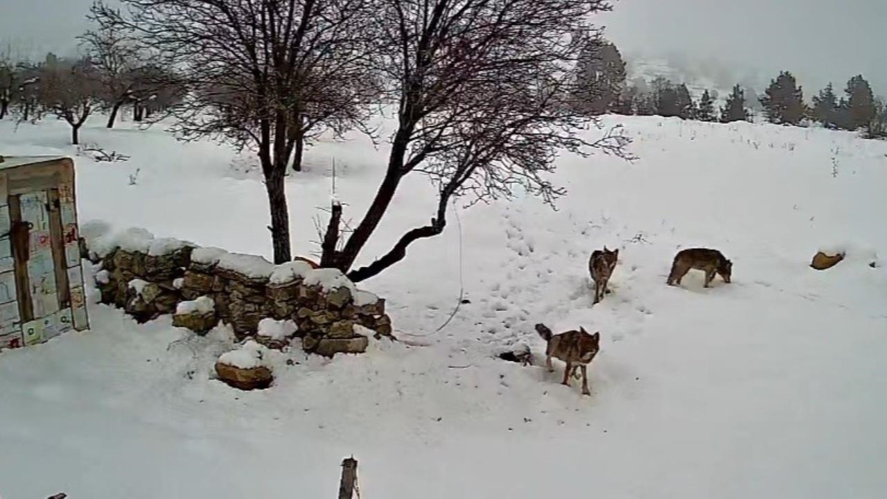 Yerleşim alanına kadar yaklaşan kurtlar, bir evin bahçesine girmeye yeltenirken yaşananlar saniye saniye kaydedildi.