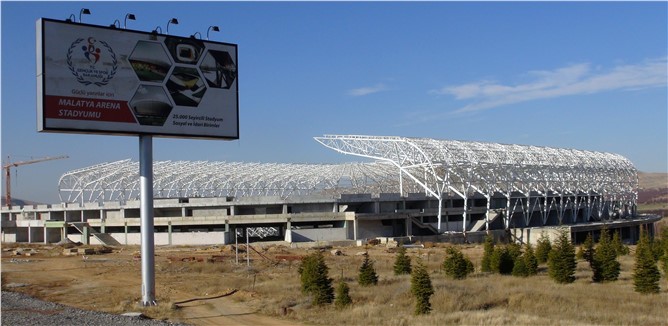 Malatya - Elazığ karayolunun 12. kilometresinde inşa edilen ve kayısıyı anımsatan objelerin kullanılacağı stadyum inşaatı, yüklenici firma İlsan İnşaat’ın mali sıkıntı yaşaması nedeniyle yapıyı tamamlayamayınca sözleşmesi önceki ay feshedilmişti. 2012’de temeli atıldığında 2015’te bitirileceği açıklanan stadyum inşaatının yüzde 70 gerçekleştirildi. Yarım kalan işin tamamlanması amacıyla ikinci kez ihale takvimine eklenen Malatya Arena Stadı’nın ihalesi, hazırlık işlemlerinin tamamlanmaması nedeniyle TOKİ tarafından 14 Aralık tarihine ertelendi. 25 bin seyirci kapasiteli stadyum inşaatıyla altyapı ve çevre düzenlemesi inşaatı tamamlama ihalesi dün gerçekleştirildi.