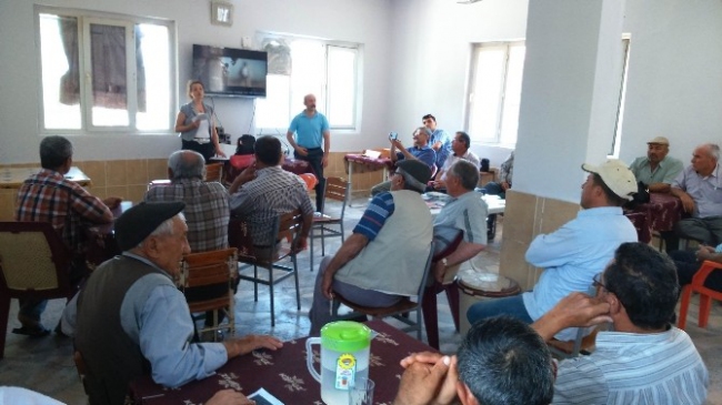Buharkent Kızıldere Mahallesi'nde düzenlenen eğitimde, üreticilere bitki koruma ürünlerinin doğru kullanımı hakkında bilgiler verildi.
