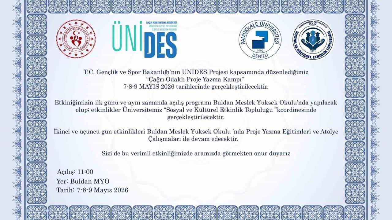 Pamukkale Üniversitesi Buldan Meslek Yüksekokulu, Gençlik ve Spor Bakanlığı tarafından yürütülen ÜNİDES (Üniversite Öğrenci Toplulukları İş Birliği ve Destek Programı) 6. Dönem kapsamında dikkat çekici bir projeye ev sahipliği yapacak. "Çağrı Odaklı Proje Yazma Kampı (İleri Düzey): Erasmus+ / ESC / ÜNİDES / IPA Başvuru Uygulamaları" adlı çalışma, Buldan MYO Sosyal ve Kültürel Etkinlikler Topluluğu ile Pamukkale Üniversitesi Genç Ofis’in iş birliğiyle yürütülecek.