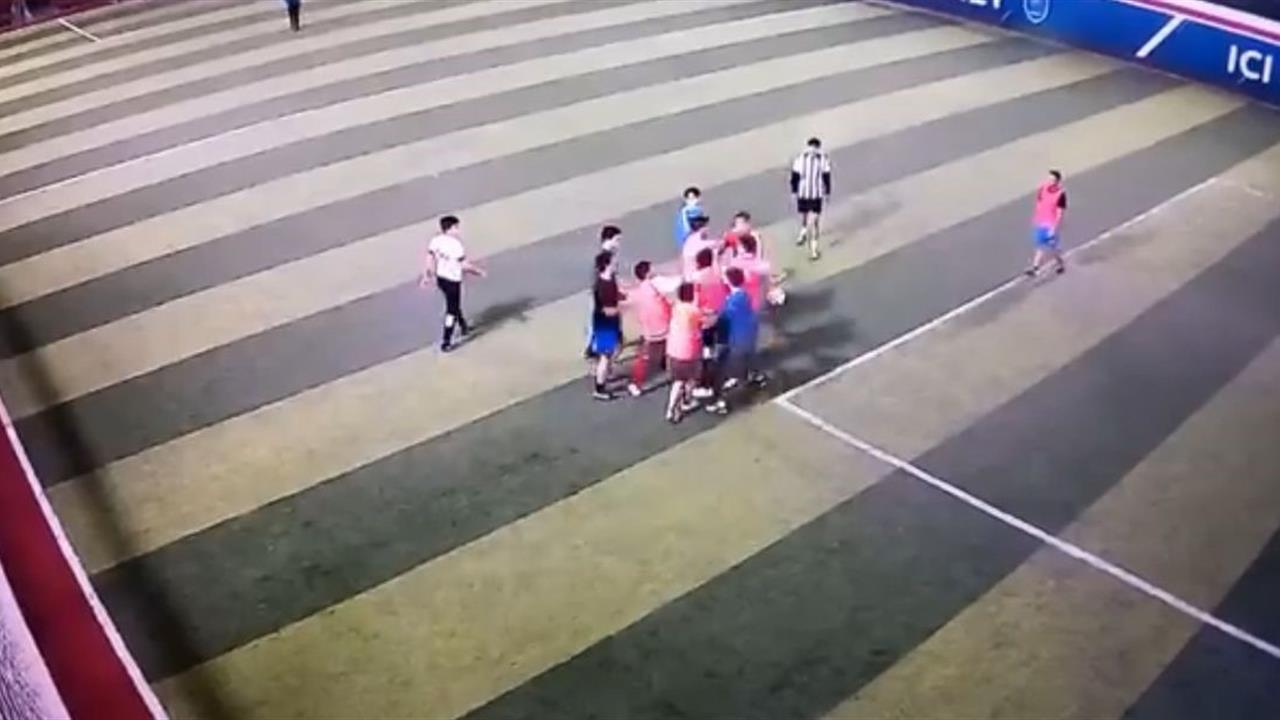 Bursa'nın Nilüfer ilçesinde halı saha maçında tartışma büyüyerek kavgaya dönüştü. İki takımın oyuncuları arasındaki gerilim, yumruk ve tekmelerle sonuçlandı. Olay anı çevredeki bir kameraya yansıdı.