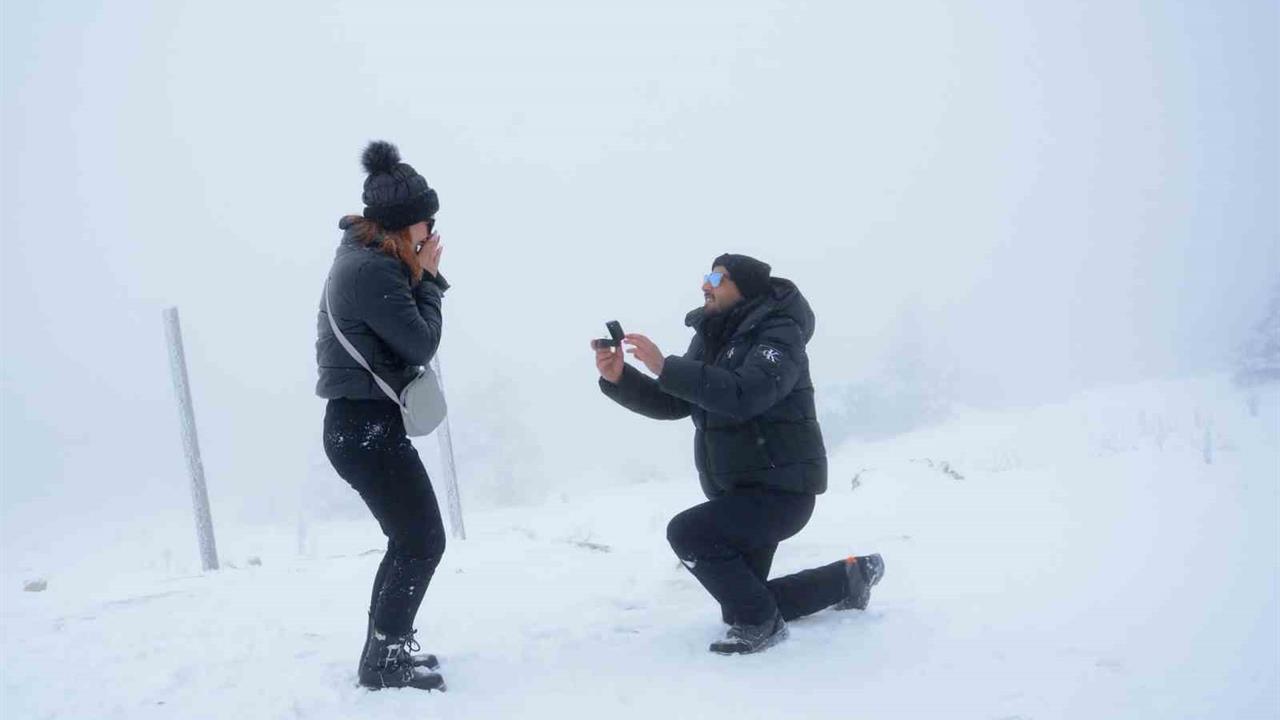 Halil Şirinbaş, diz çökerek Züleyha Eratıcı’ya evlilik teklif etti. Zirvenin dondurucu soğuğuna rağmen, aralarındaki sevgi tüm sıcaklığıyla hissedildi. Züleyha Eratıcı’nın büyük bir mutlulukla yanıtladığı "Evet" cevabı, çevredeki tatilcilerin alkışlarıyla karşılık buldu. Böylece, bu çift 2026 yılının ilk evlilik teklifi olarak hafızalarda yer etti.