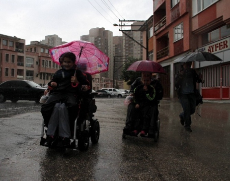 Olay, Bursa'nın Osmangazi ilçesindeki Cem Sultan Lisesi'nde gerçekleşti. Edinilen bilgilere göre, kas hastası olan Hakan (35) ve Seda Kabakçı (36) çifti, çocukları Cemre (8) ve Ecrin (6) ile birlikte oy kullanmak için okula gitti. Oylarını kullandıktan sonra çıkışta aniden bastıran sağanak yağmur, çiftin dönüş yolunu zorlaştırdı. Seda Kabakçı, seçim sonuçlarının ülke için hayırlı olmasını dileyerek, "Bu yağmurlu havada çok zorlandık. Ama bu vatan hepimizin, hepimiz oyumuzu kullanmak zorundayız. Biz de üzerimize düşen vazifeyi yaptık," ifadelerini kullandı. Çift, seçim sonuçlarında hangi partinin kazanacağına dair umutlarını da dile getirdi.