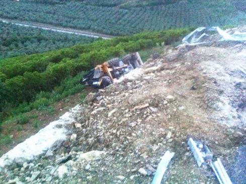 Bursa ilinin İznik ilçesinde, yokuş aşağı inen bir iş makinası şarampole devrildi. Olay, İznik-Yenişehir yolunun Derbent köyü mevkiinde gerçekleşti. İş makinasını kullanan R.T, çalışma yaptığı taş ocağından ayrıldıktan sonra İznik'e gitmekteydi. Ancak virajı alamayan makine, yol kenarındaki korkulukları kırarak aşağı yuvarlandı.