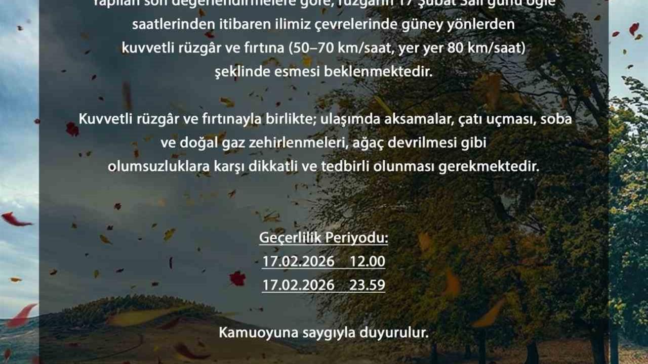 Valilik açıklamasında, uyarının 17 Şubat 2026 saat 12.00 ile 23.59 arasında geçerli olacağı kaydedildi. Vatandaşların bu süre zarfında dikkatli olmaları ve gerekli önlemleri almaları konusunda bilgilendirildiği ifade edildi.