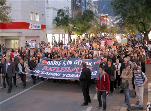 'Barış için gittik, katledildik, hesabını soracağız' yazılı pankartla yürüyen gruba milletvekilleri ve diğer vatandaşlar da destek verdi. Ellerinde patlama sırasında hayatını kaybedenlerin fotoğraflarını taşıyan kalabalık, 'Direne direne kazanacağız', 'Yaşasın halkların kardeşliği', 'Katil devlet hesap verecek', 'Faşizme karşı omuz omuza', 'AKP savaş, halklar barış istiyor', 'Gün gelecek, devran dönecek, AKP halka hesap verecek', 'Hükümet istifa' ve 'Hırsız, katil Erdoğan' şeklinde slogan attı.