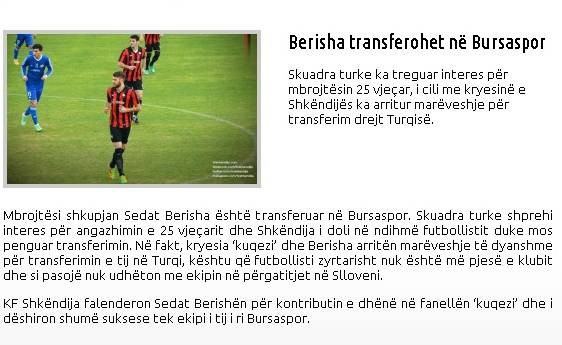 Makedon kulübü, transferi resmi internet sitesinden duyurarak, Berisha'nın kulübe verdiği katkılar için teşekkür etti. Açıklamada, Bursaspor'da başarılar dilenen Berisha, bu sezon Shkëndija formasıyla 17 maçta 2 gol atma başarısı gösterdi. 1.90 boyundaki stoper, Makedonya milli takımında da 1 kez forma giydi.